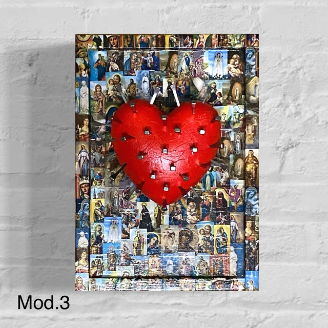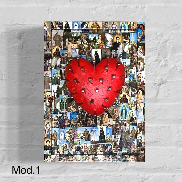 Un cuore trafitto da chiodi, sospeso su un mosaico di icone sacre. Il simbolo della fede si intreccia con il dolore, ricordandoci che l’amore, divino o umano, porta con sé sacrificio e resistenza.